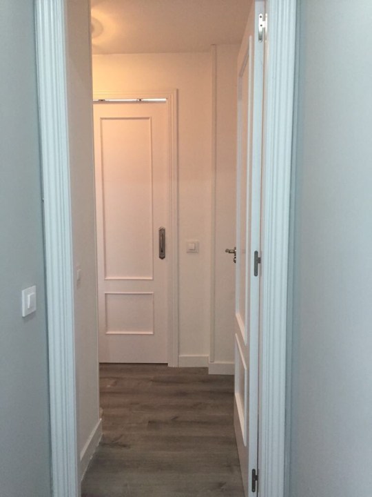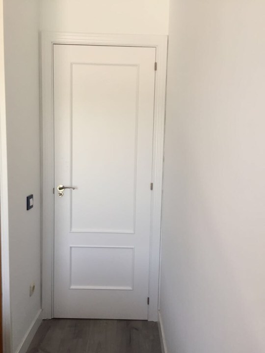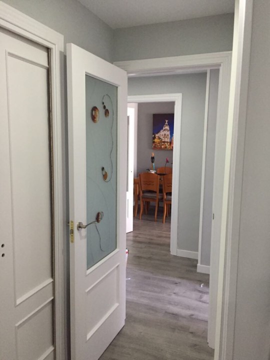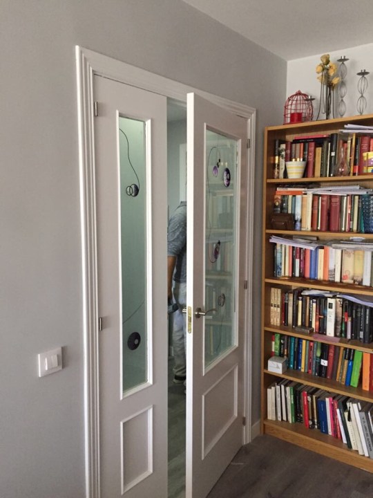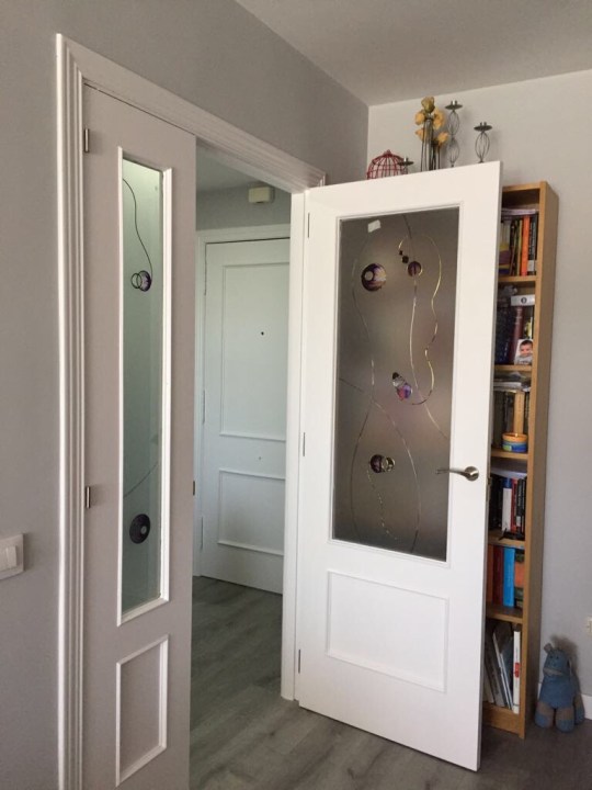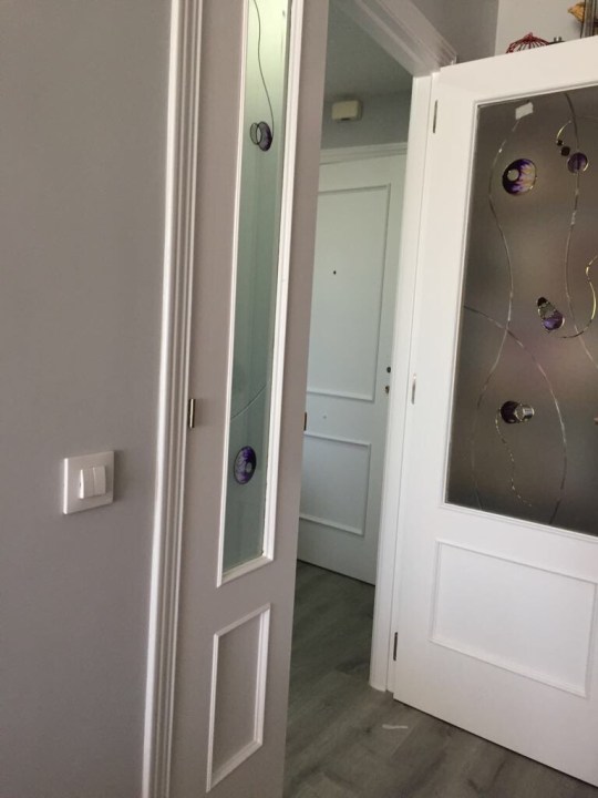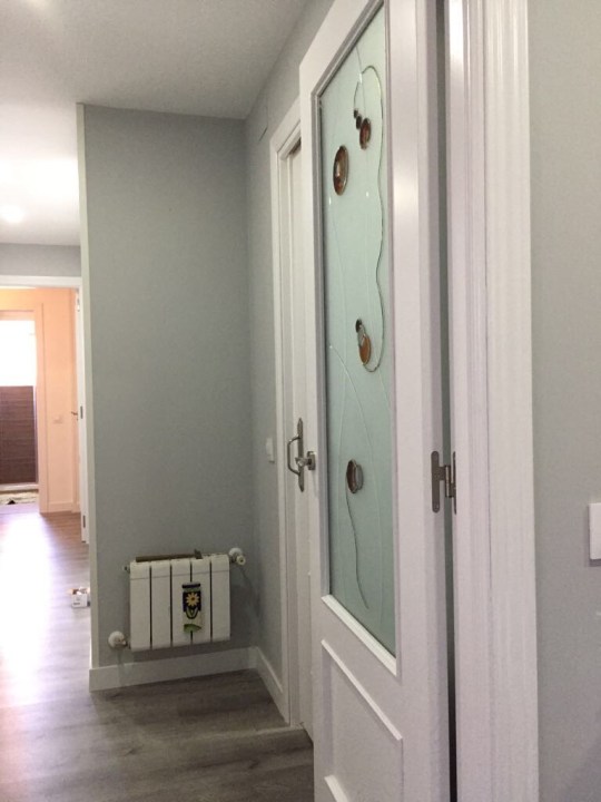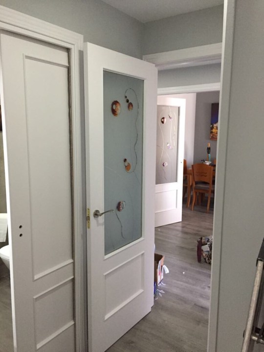 - Puertas de paso con cristal y puertas de armarios lacadas en blanco y sustitución de manillas y rosetas
