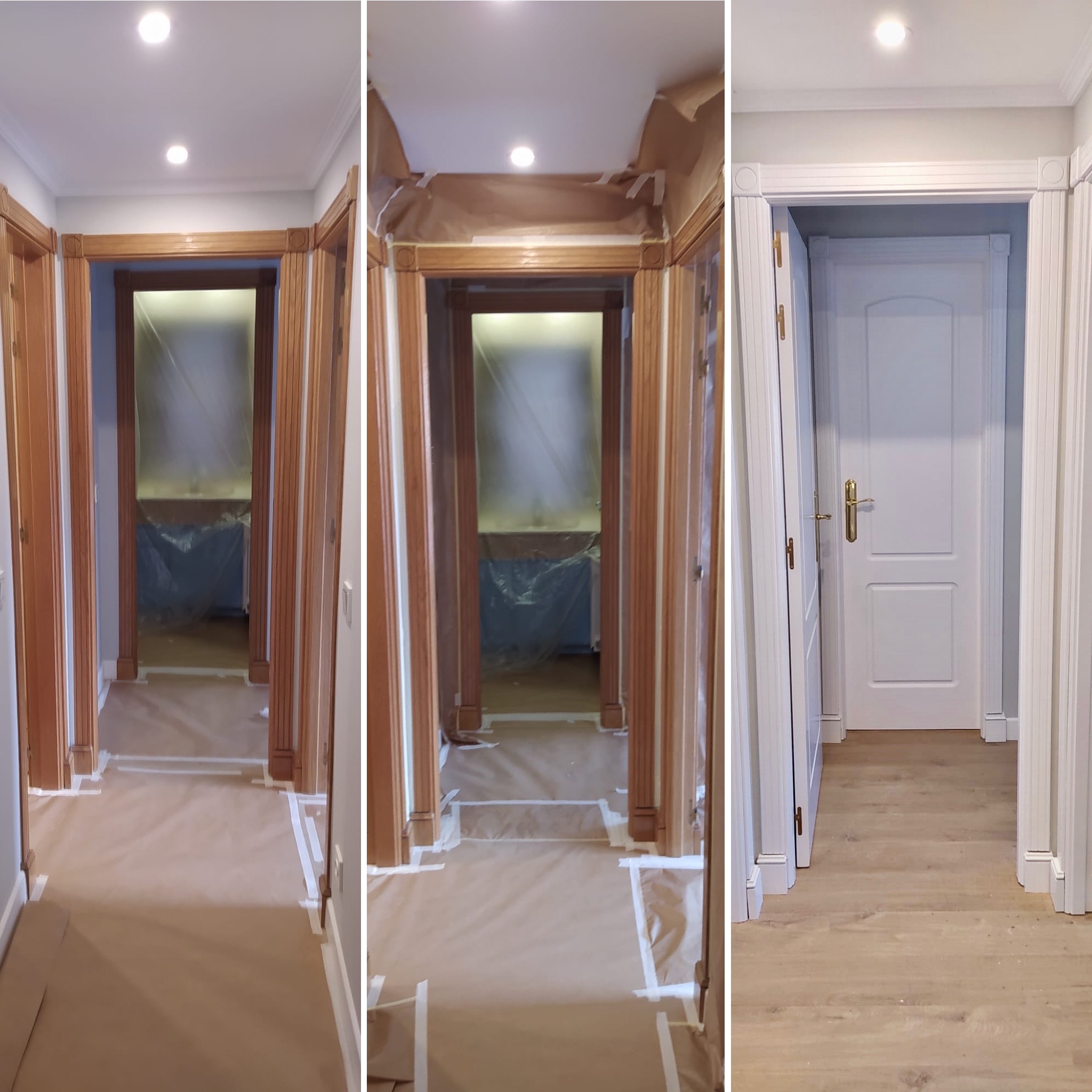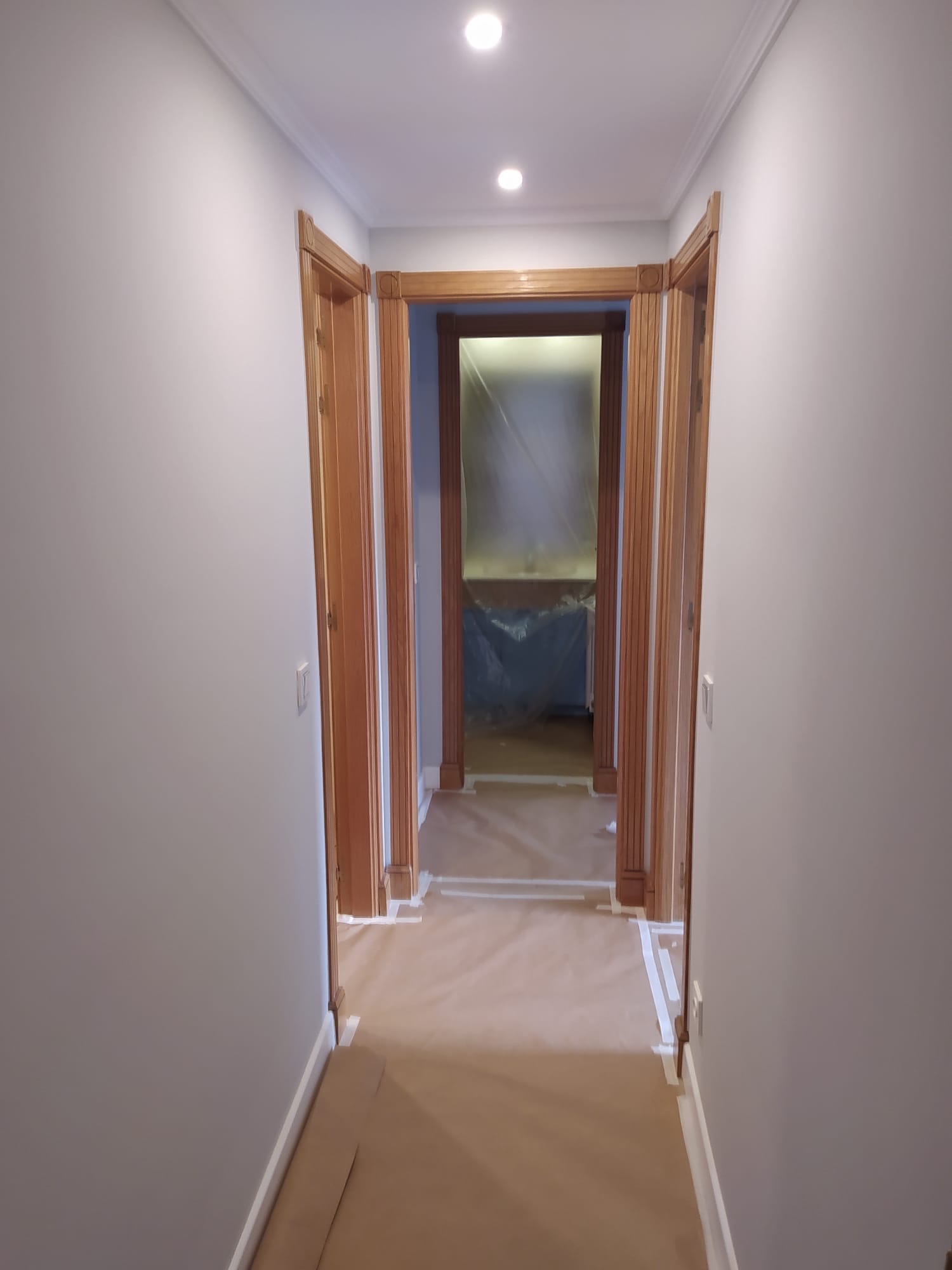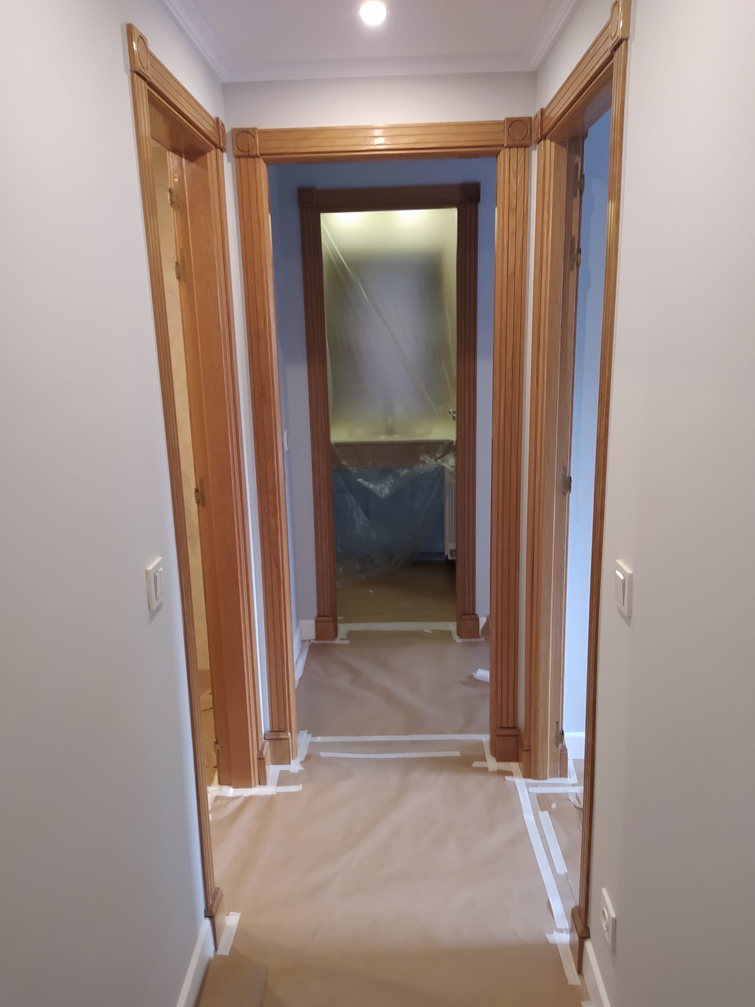 Pasillo de la casa, marcos y puertas lacados en blanco. Máxima protección y limpieza y todo correctamente aislado para un trabajo limpio y cuidado.