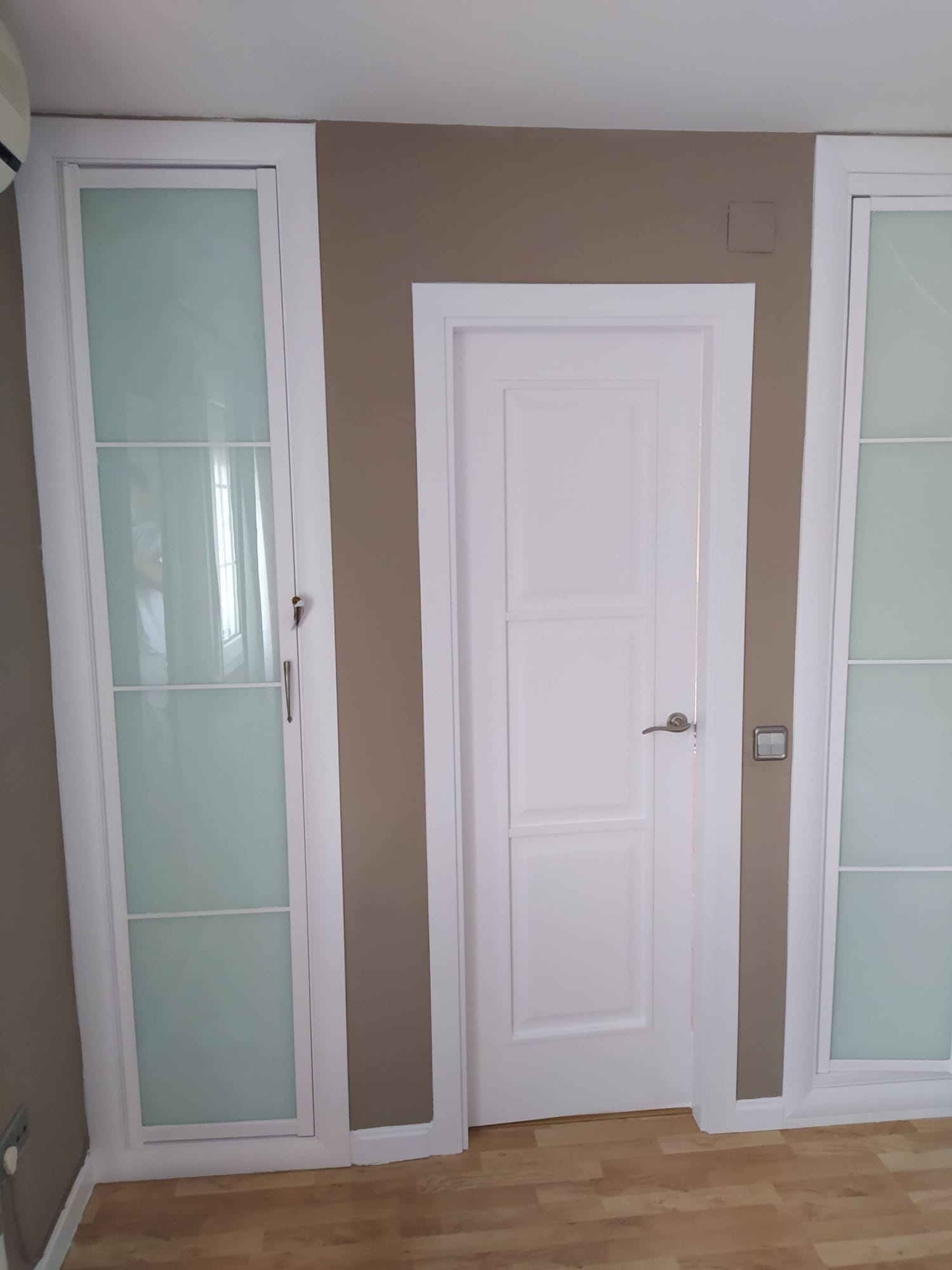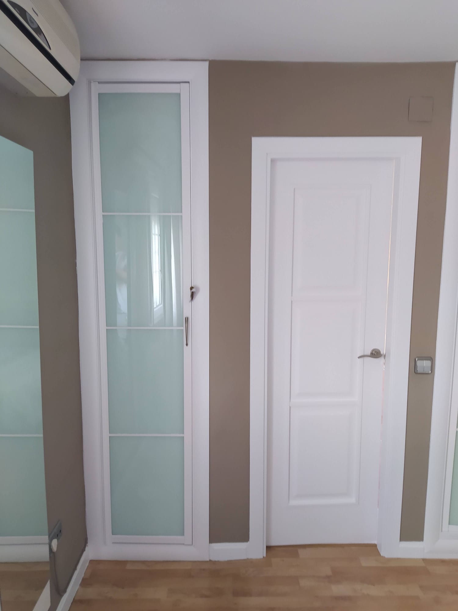 - Puertas de paso con cristal y puertas de armarios lacadas en blanco y sustitución de manillas y rosetas