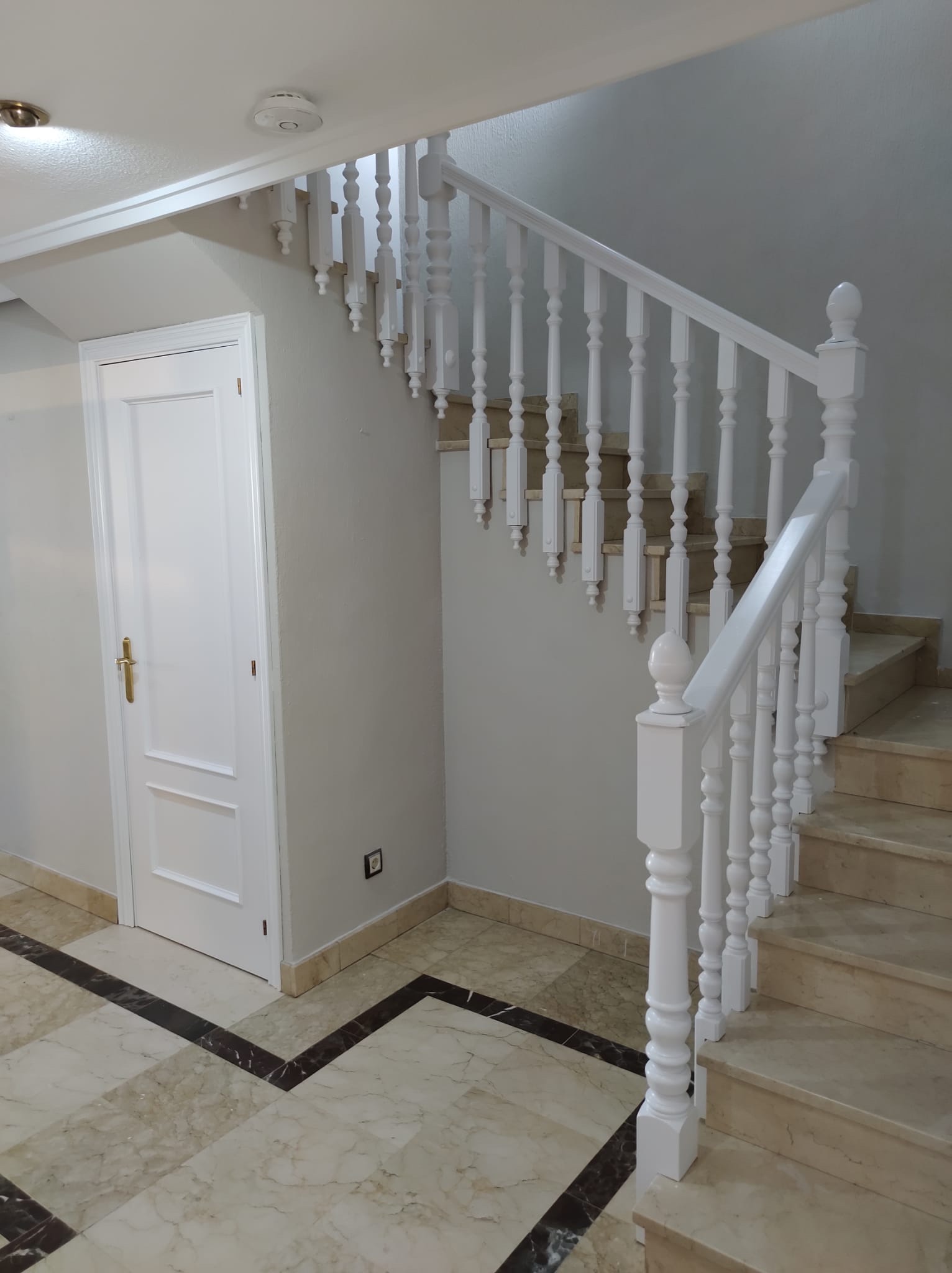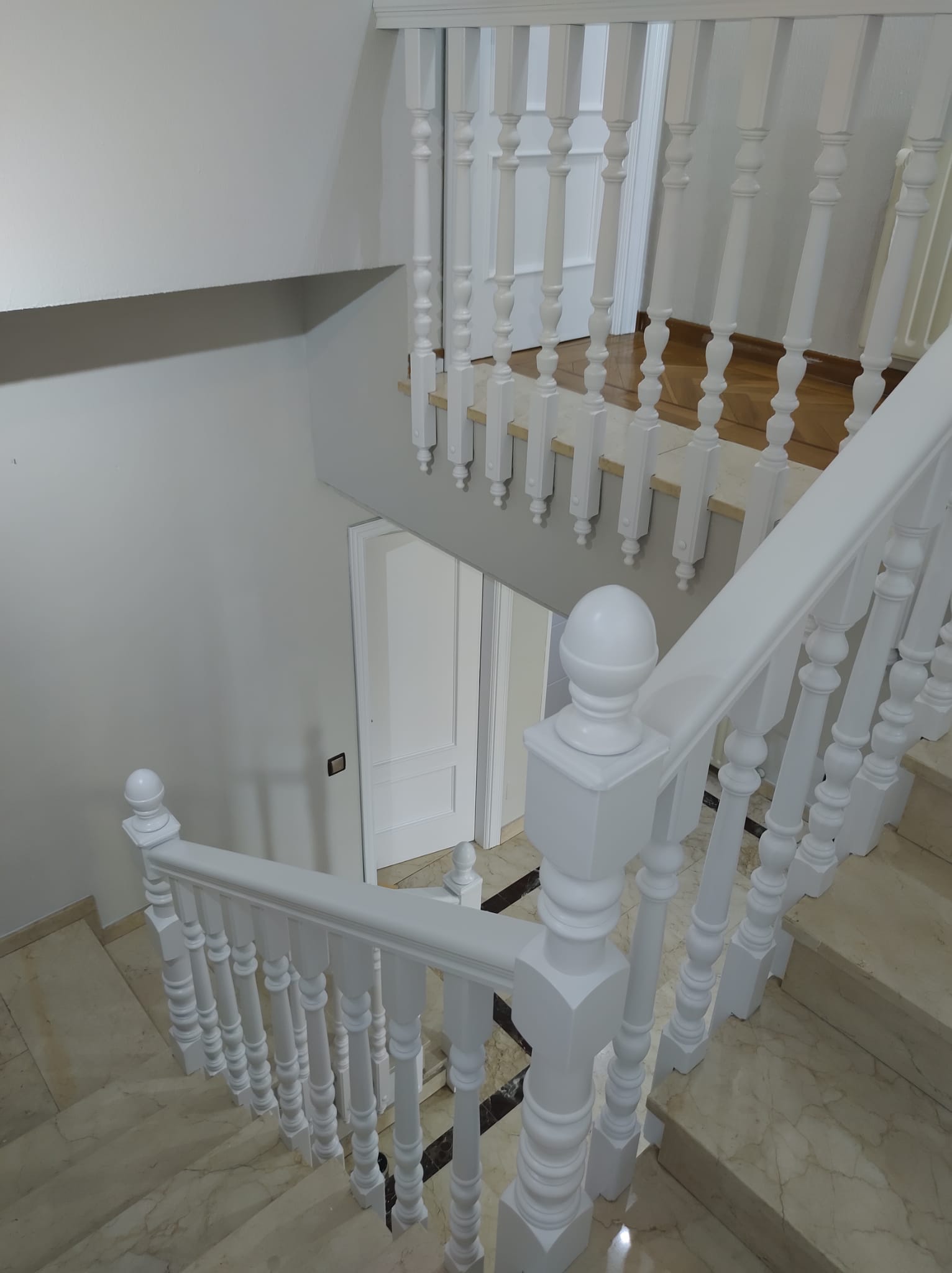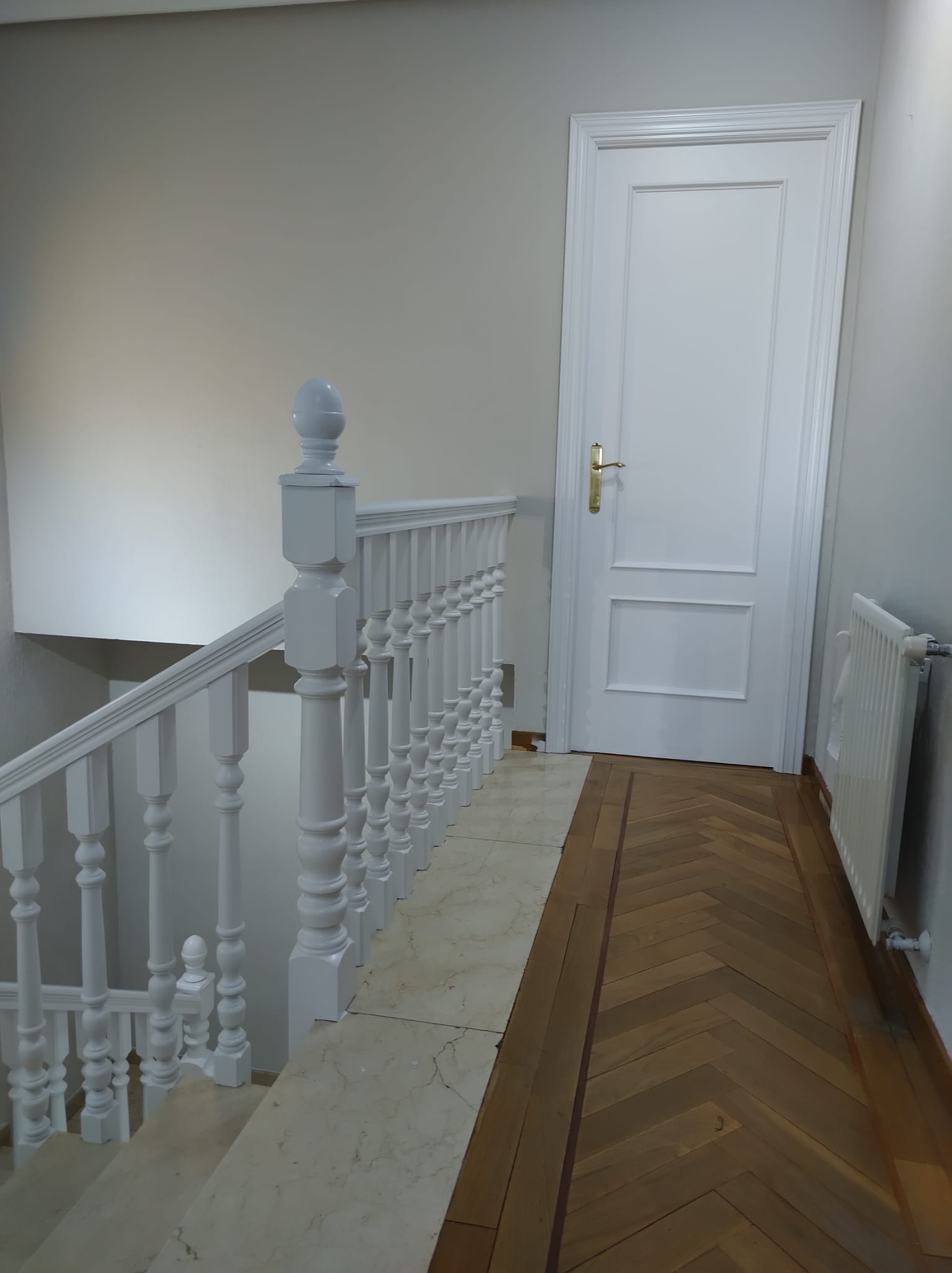 Se han realizado trabajos de lacado en pintura blanca satinada en puertas, armarios, barandillas de toda la casa. Puertas lacadas en el taller aplicando imprimación y dos capas de pintura blanca con pistola. Marcos, jambas, barandillas, columnas lacadas en la casa.