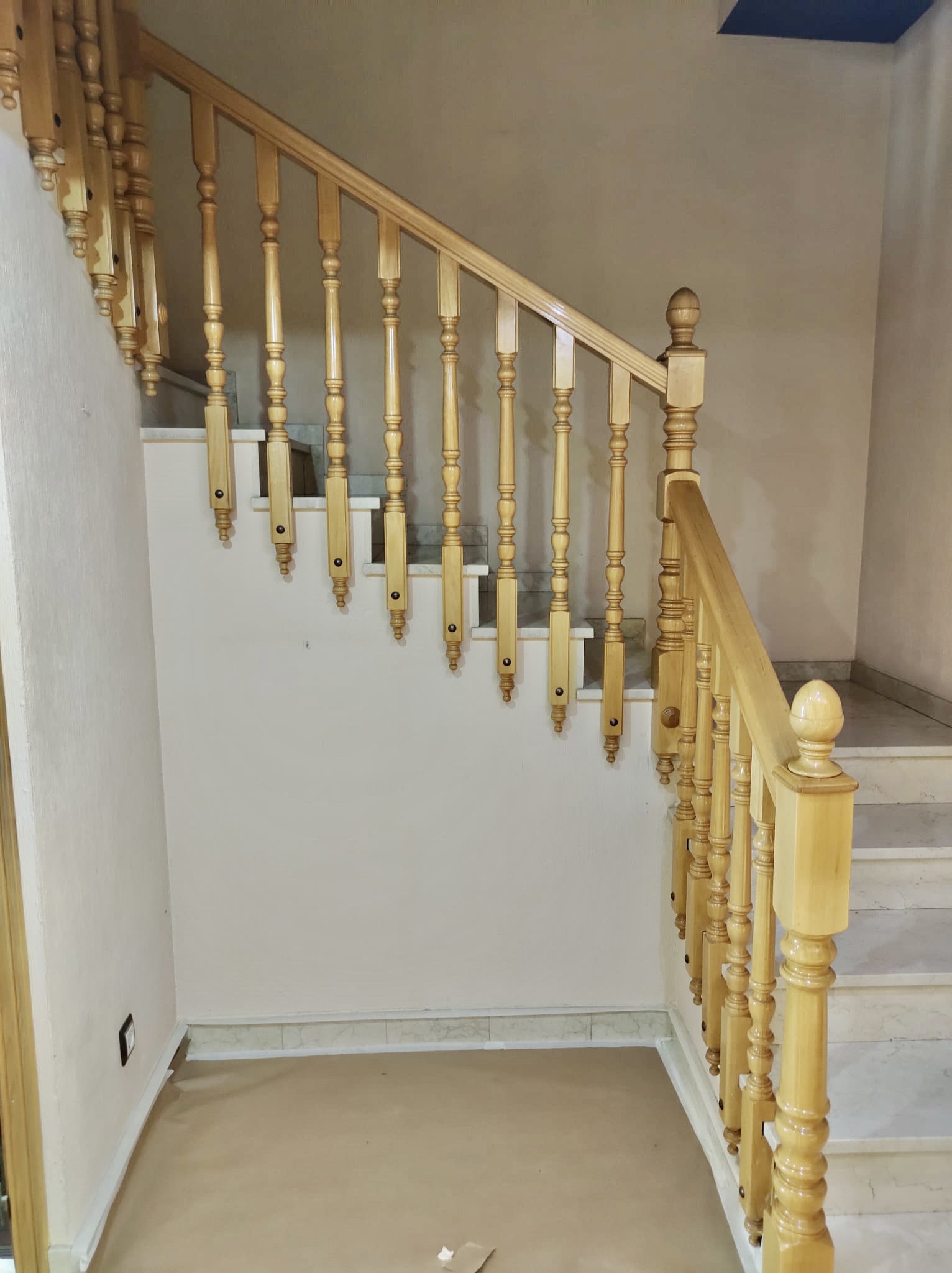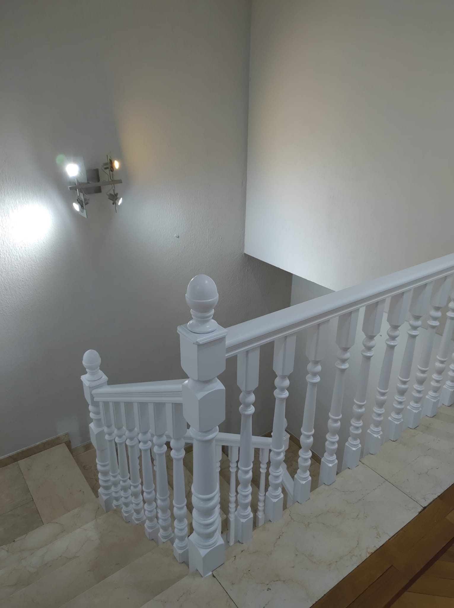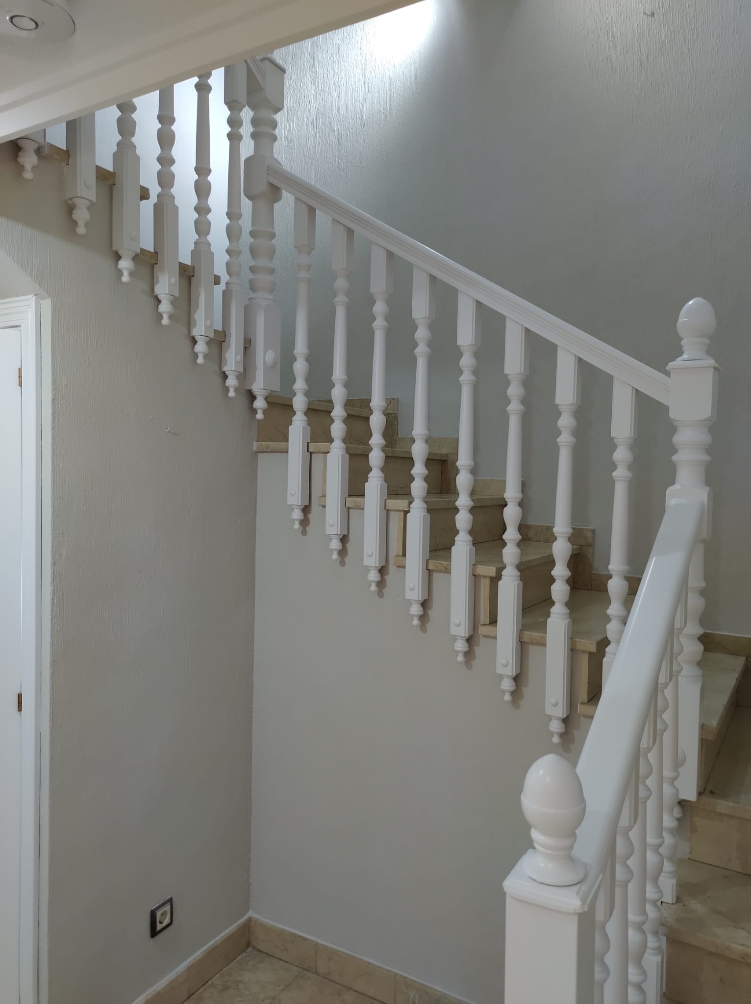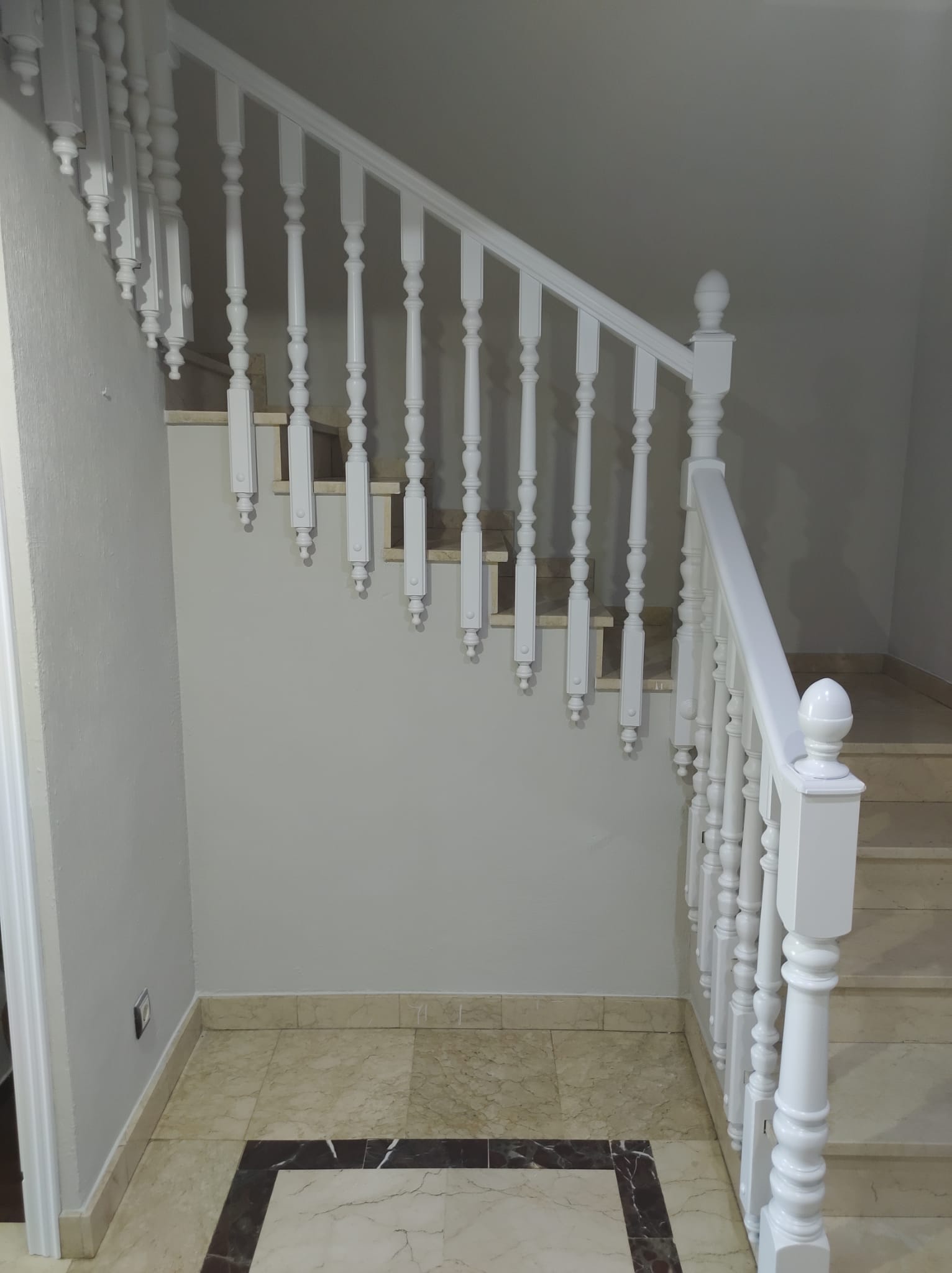 Se han realizado trabajos de lacado en pintura blanca satinada en puertas, armarios, barandillas de toda la casa. Puertas lacadas en el taller aplicando imprimación y dos capas de pintura blanca con pistola. Marcos, jambas, barandillas, columnas lacadas en la casa.