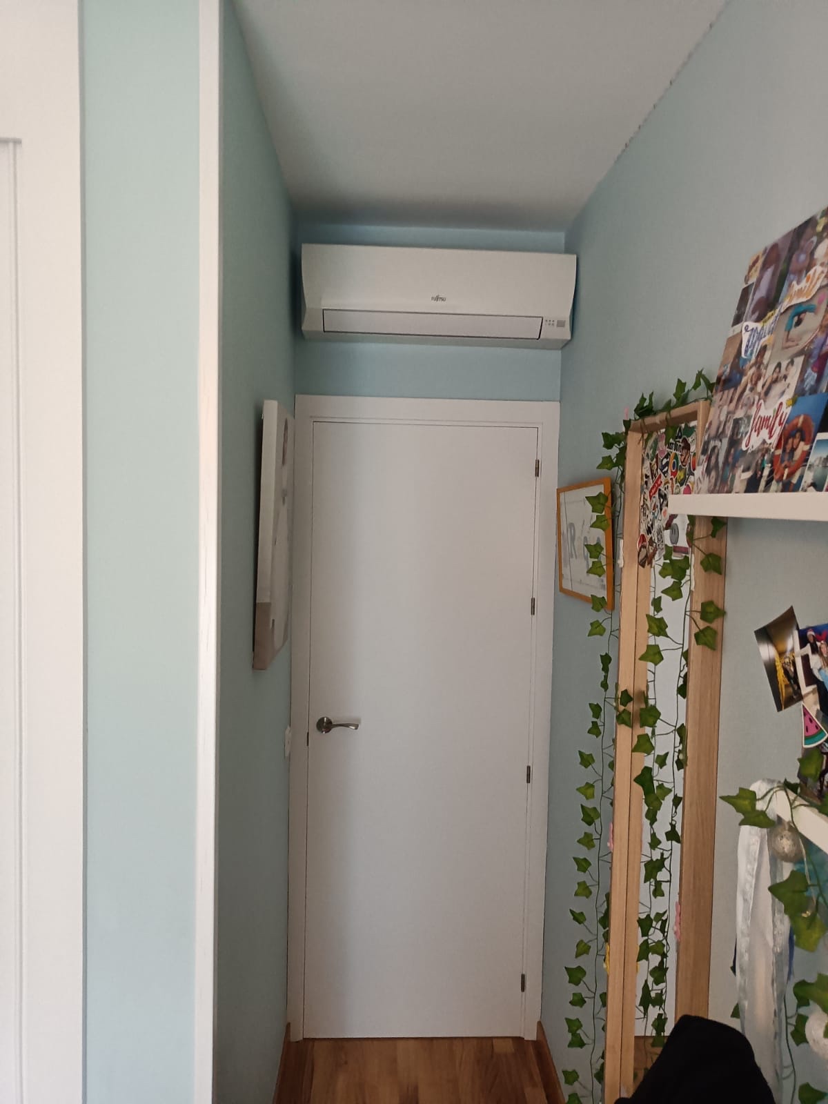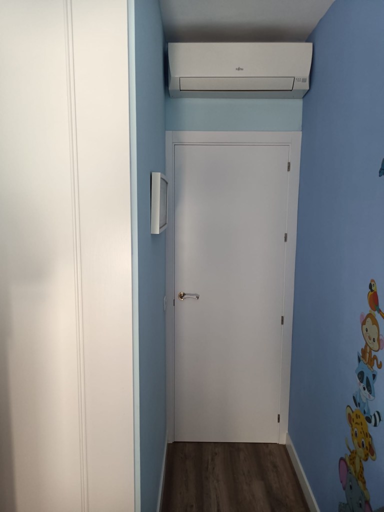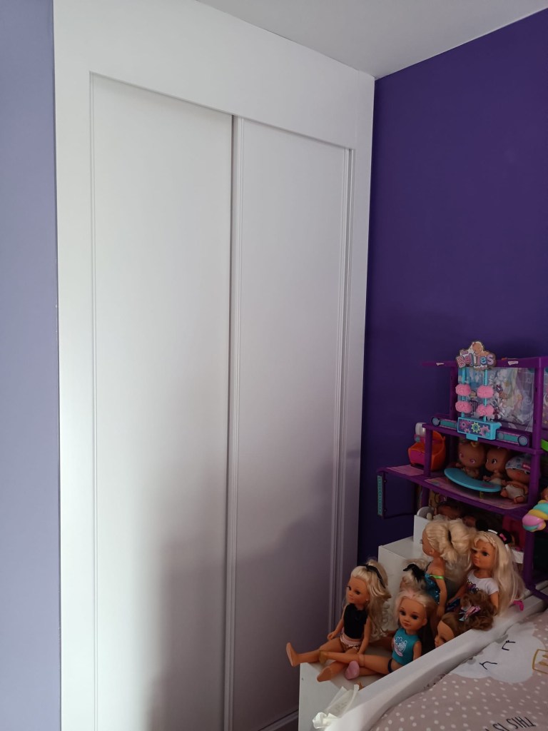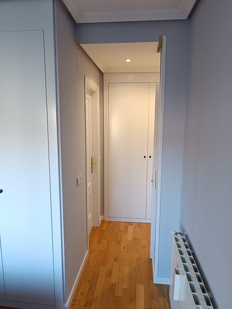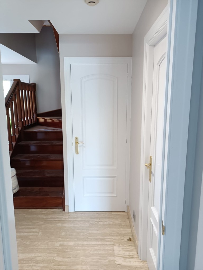 En esta casa hemos realizado trabajos de lacado de puertas de paso y armarios, cambio de rodapiés y pintura plástica en paredes y techo. Las puertas han sido lacadas en el taller.