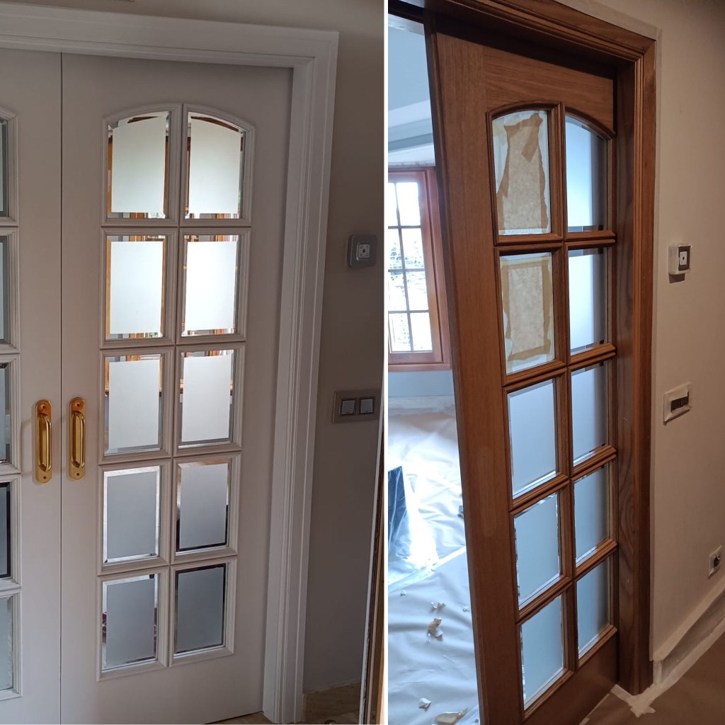 Las puertas clásicas marrón barnizadas se transforman después del lacado en blanco, ofrecen luminosidad y un cambio muy notable al hogar.
