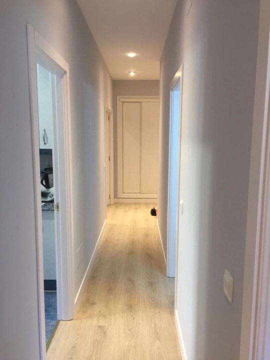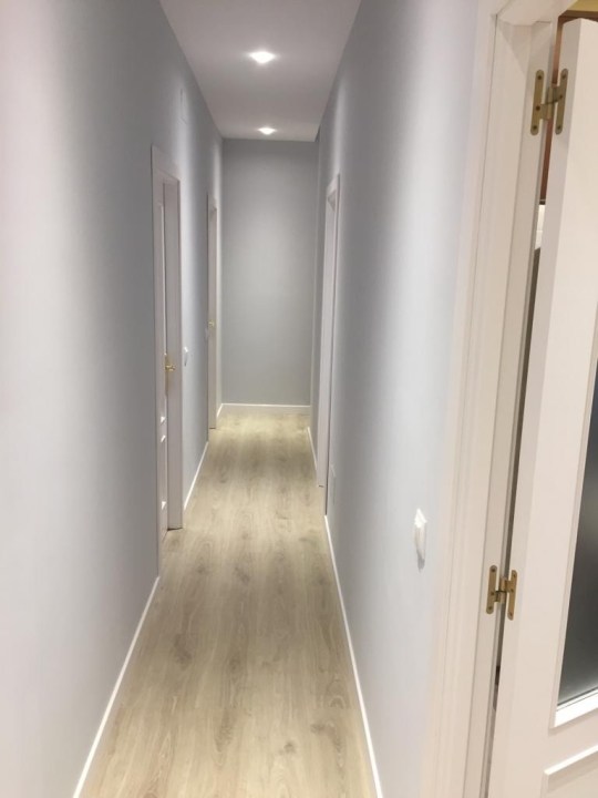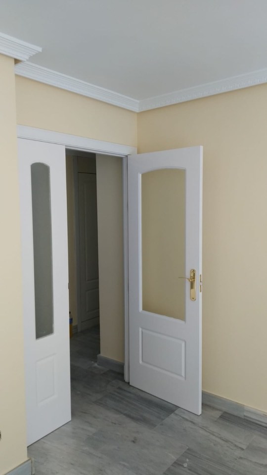 En este caso aparte de alisar las paredes , se ha realizado el trabajo de lacado en color blanco de todas las puertas del piso, cambiar rodapie a juego con las puertas y tarima. Ha quedado espectacular.