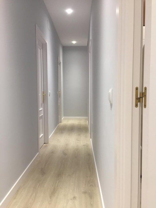 En este precioso piso de Las Rozas se han realizado varios trabajos, lacado en blanco de todas las puertas de paso y armarios de la casa, pintura paredes a elección del cliente, cambio de rodapié por uno blanco a juego con las puertas y cambio de tarima.