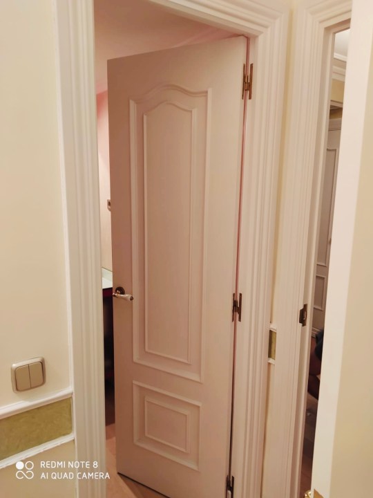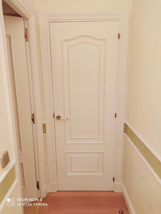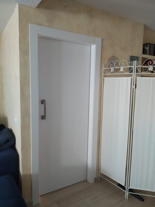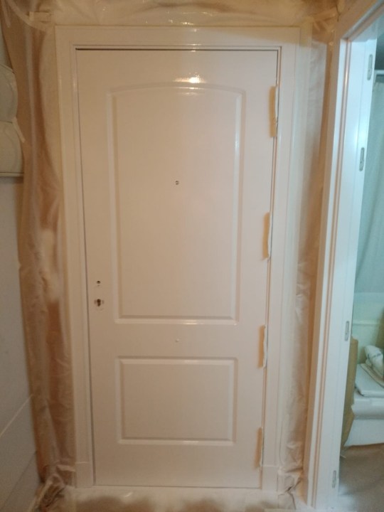 En esta vivienda hemos realizado trabajos de lacado de puertas en blanco. Las puertas han sido pintadas en taller a pistola. Jambas y cercos se pintan también a pistola en el domicilio, todo bien protegido y limpio.